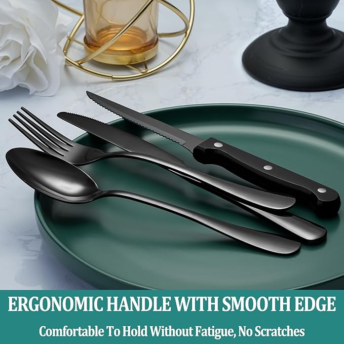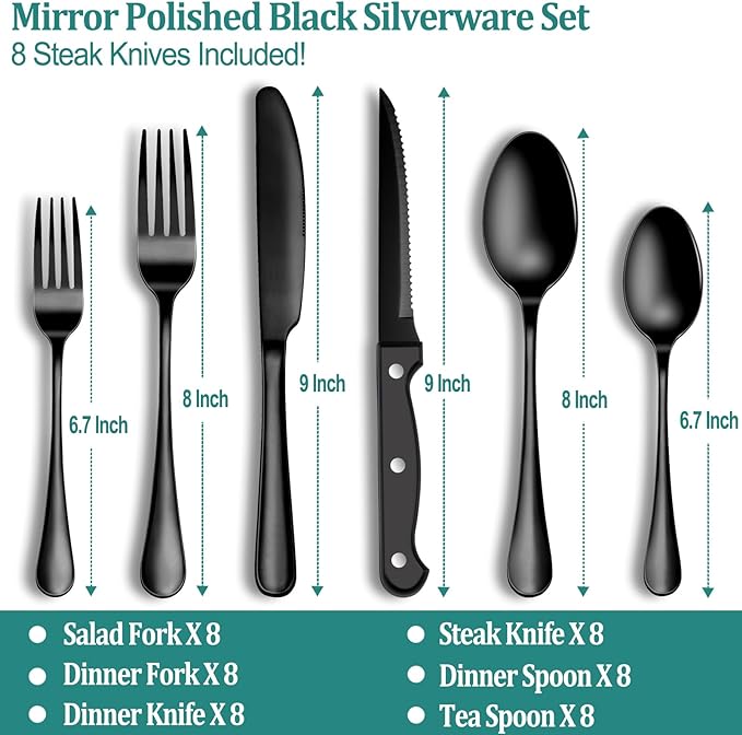 【48 PIECES BLACK SILVERWARE SET FOR 8】: This flatware set contains 8 dinner forks, 8 salad forks, 8 dinner spoons, 8 dessert spoons, 8 dinner knives and 8 steak knives. Great for home, restaurant, hotel, buffet, gathering, wedding, camping, party and entertaining. If you are going to have a picnic or a party , then this set of tableware can not only meet your requirements, but also make your dinner full of design. 【HIGH QUALITY AND DURABLE】: This silverware set is made of FOOD GRADE stainless steel which is very durable, corrosion resistant, rust-proof, non-toxic, BPA free, no metal aftertaste. Meanwhile, its sturdiness ensures that it will not bend easily providing you with long - term use. 【UNIQUE BLACK LOOK】: The mysterious black appearance stands out from ordinary silverware, making it look more retro and vintage, just like a noble flatware used in the manor, smooth surface and fine workmanship make it more luxurious and create an elegant, noble and luxurious dining atmosphere. There is no need to worry about fading or cracking, as this is a metal layer from vacuum plating technology. If you want to be different in tableware, you won’t miss it. 【PROPER WEIGHT AND ERGONOMIC HANDLE】: Unlike other brands, the curvature of our utensil handles is designed according to the posture of the hand, and the appropriate weight and perfect balance are added to ensure maximum comfort during use that avoids you feel tired. Moreover, the smooth edges ensure safety and no scratches. 【8 STEAK KNIVES INCLUDED】: We have 8 additional steak knives with sharp serrations on the blades, which makes it easy to cut meat and ideal to use for eating. The triple riveting handle is strong and durable even when cut hard, and the ergonomic design makes it very comfortable to hold. Functions as a steak knife and a utility knife. No need to purchase other meat knives else. 【USE AND CARE】: It is recommended to wash by hand, wipe dry before storing. Do not use wire brushes, hard sponges or clean cloths and other hard materials cleaning tools to avoid damage the silverware.【EXCELLENT SERVICE】: We have a very efficient after-sales service team, If you have any questions about our black silverware set, Please feel free to contact us, We will try our best to give you a satisfactory answer.