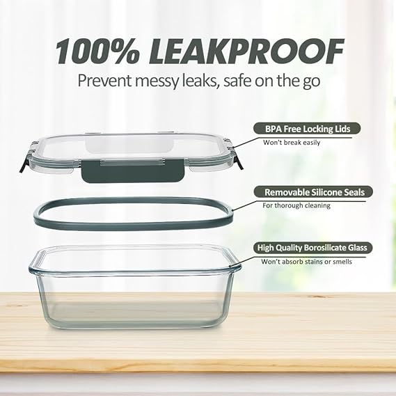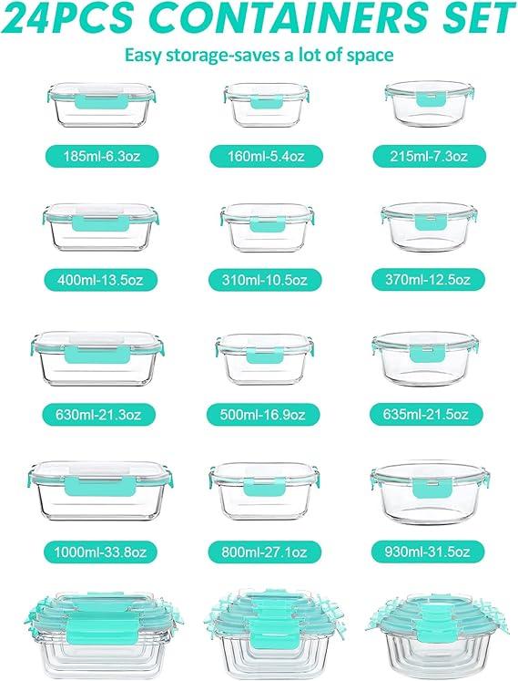 HIGH QUALITY GLASS MATERIAL: Glass meal prep containers are made of high quality borosilicate glass, for oven, microwave, dishwasher and freezer. Stronger than cheaper glass food storage containers, food can be stored in glass containers directly after cooking. The containers are versatile to meet your everyday food storage needs, perfect for prep meals at home or whatever you need for the occasion. 24 PIECE GLASS FOOD CONTAINERS SET: 12 glass food storage containers with 12 lids with 12 various sizes and 3 shapes for meal prep, office lunches, leftovers, portion control, bringing to the gym, picnics, travel and more. Package includes: 1 (33.8 oz) 1 (21.3oz ) 1 (13.5oz ) 1 (6.3 oz)1 (27.1 oz) 1 (16.9 oz) 1 (10.5 oz) 1 (5.4 oz) 1 (31.5 oz) 1(21.5 oz) 1 (12.5oz ) 1 (7.3 oz) glass lunch containers with locking lids. They stack together and take up less space AIRTIGHT LOCKING LIDS: VERONES airtight glass lunch containers use BPA-free snap-lock lids. Make sure there are no spills and leaks, keeping your food fresh, you never have to put up with spilled soup or sauce staining your lunch containers again. The lid opens and closes easily and does not break or slowly stop working. Ovens, microwaves and dishwashers are not lid friendly, please remove the lid before heating food or washing. SAFE & PORTABLE: Compared to ordinary plastic meal prep containers, our glass meal prep containers are non-toxic and long-lasting, won’t absorb food flavors, or stains, and make them easy to clean. Different sizes and shapes are perfect for various occasions and events. QUALITY CUSTOMER SERVICE: If you have any questions or not satisfied with your regarding the VERONES glass containers set please do not hesitate to send the seller a message through Amazon we will respond within 24 hours.