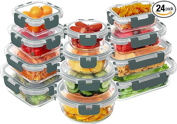 VERONES 24 Pieces Glass Food Storage Containers Set, Airtight Glass Lunch Containers, Glass Meal Prep Containers with Lids,BPA-Free, for Microwave, Oven, Freezer & Dishwasher Friendly,Grey