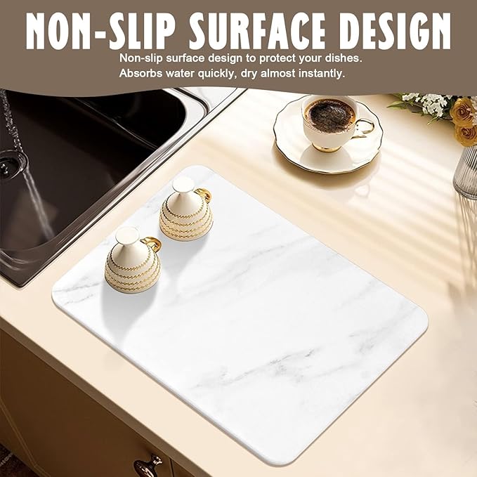 FOOD GRADE MATERIAL: The kitchen counter mat is eco-friendly, made of High-quality & Non-Toxic diatomaceous earth that is perfect for your home and kitchen SUPER ABSORBENT & QUICK DRY: Diatomaceous earth can hold exceptional absorbency and moisture-wicking properties that quickly evaporate water from the surface in minutes NON-SLIP & HEAT RESISTANCE: It comes with 4 Clear Self Adhesive Pads to achieve a double anti-slip effect; Also, it’s an perfect heat-resistant mat up to 450°F/230°C, it can be used together with the baking tray, which has the cooling effect MINIMALIST DESIGNS: The simple and elegant design of the stone dish mat makes it a perfect addition for your kitchen WIDE USED: The stone dish drainer mats can be used on kitchen counter to place washed dishes, cups, milk bottle, knife, fork, spoon and other tableware; It can also be used as heat proof mat, bath mat, pet feeding mat, an ideal gift for mother, wife, aunt, girlfried SIZE: The size is 15.8''x11.8'', suitable for most kitchen ware and tableware WARRANTY: We provide 365 days no worry warranty, if you have any problem with the stone bath mat, please feel free to contact us to get help (return/refund in 12 months)