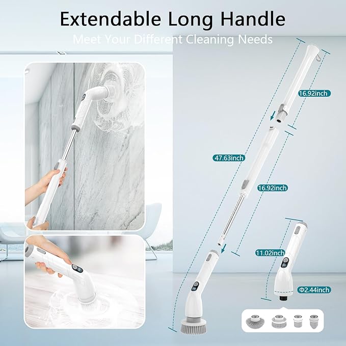 ✅【Save Time And Effort】 Upgraded Electric Spin Scrubber Cordless gets rid of the troubles caused by traditional cleaning tools. it can be used anywhere you want. This spin scrubber is super lightweight and very easy to pick up and use to clean surfaces without getting tired and drastically reduce your work time from 1 hour to 30 minutes. ✅【Powerful & Efficiency】The internal motor drives the rotating brush head to rotate at a high speed up to 450RPM±10%, can help you easily clean your entire house,especially when used with a cleaning agent, it can quickly clean stubborn stains and make entire house look new! Perfect for bathroom,bath tub,stone tile floor,grout,grooves,Toilet & etc. ✅【2 Adjustable Speed & IPX7 Waterproof 】You can easily clean your entire house in one fell swoop with this cleaning brush ,it set has 2 working speeds, I: Low Speed: 350RPM/Min; II:High Speed: 450RPM/Min; What you need to do is press the ON/OFF button once. The entire machine is IPX7 waterproof,you can wash the electric scrubber directly into the faucet without worrying about product damage. ✅ 【4 Replaceable Brush Heads】TUYU electric spin scrubber has equipped with 4 cleaning heads, a hard flat brush for large surfaces, a corner brush for curved areas, a small flat brush for detail work, and a pointed brush for gaps. All the brushes have long bristles that resist shedding and won’t scratch surfaces. which can be suitable for bathroom, kitchen, table, bathtub, floor,windows and Car various scenarios to meet most of your requirements. ✅【Adjustable extension Rod】The electric shower scrubber equipped with extendable stainless-steel handle . The handle can freely extends from 26 inches to 45 inches easy to clean hard-to-reach places, without kneeling or bending over. Say Goodbye to Traditional Cleaning Tools.A new type of household cleaning tools that can change your life! ✅【LED Display & Fast Charging 】Equipped with an LED digital display of battery usage,you will never need to worry about running out of power. The electric spin scrubber used fast charging technology, equipped with Type C charging port ,you can recharge it easier.Indicator light will be red when it's charging and get green when it's full. ????【Perfect Gift For Family And Friends】Portable cordless hand-held shower scrubber is ergonomically designed, you can use the electric cleaning brush to do housework in the most relaxed posture, no need to bend down and kneel to clean, take care of your waist and joints, save time and effort. it is an ideal gift for family, parents and friends, make housework a fun.
