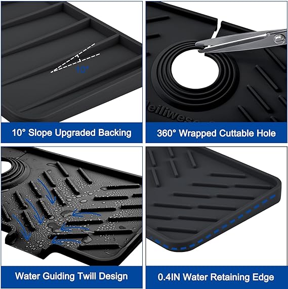 【Slope Improved】 We improved the overall slope, up to 0.3 inches at highest and up to 10°degrees, which means a greater slope, allowing surface water to drain away more easily and always keep your sink & faucet area dry. 【Better Adaptable】Adaptable to multiple sizes, we planned an installation hole from 4cm to 7cm, and it has 360° wrapping to adapt to more diameters faucets and better wrap around your faucet. 【Perfect Organizer】 The areas on both sides of the round hole can be used to store your daily cleaning tools and detergents. You can place brushes, sponges, and detergents on it to keep your countertop tidy. 【Premium Quality】 Made with 100% food grade silicone, our splash guard is better than other fabrics available. It's safe, durable and easy to clean, providing long-lasting use. 【Multiple Uses】This versatile splash guard can be used in various areas of your house, including the kitchen, bathroom, laundry, sink, farmhouse, bar, and RV.