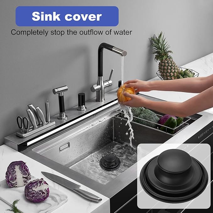 【DURABLE & SAFETY】Sink strainer is made of durable stainless steel with black powder coating on the surface, which is strong and not easily deformed, anti-corrosion and rust-proof. All edges surrounded by a wrap to prevent sharp edges from scratching hands, making it safe and reliable to use, easy to clean and dishwasher safe! 【ANTI-CLOGGING】Kitchen sink drain basket with 2mm diameter hole allows water to flow smoothly into the drain, while catching large food particles or utensils, preventing any residues or utensils from getting stuck in the drain pipe, anti-clog technology and keeps your drains clog-free! 【HOLD WATER EFFICIENTLY】Sink stopper with high sealing rubber bottom ring and prevents water leakage. Just put the cover on the sink drain to effectively hold the water in the sink, which is convenient for cleaning fruits and vegetables without worrying about the overflow of water. 【STANDARD USE SIZE】The kitchen sink strainer is suitable for most standard kitchen sink drains with 3-1/2 inch universal drain hole or old sink filters in the United States,such as Kohler,Waste King disposal.and garbage disposals. 【2 IN 1 STRAINER & STOPPER】Sink stopper strainer with basket can be used as 2 methods, push it into the bottom, it's a stopper, pull it out a bit, it's a strainer. as a strainer, it can effectively catch any large food particles and lock dirty small garbage, allowing water to drain quickly to prevent clogging; as a stopper, can easy to lock the drain pipe to prevent water from flowing into the drain pipe, keep the water in the sink, convenient for you to wash fruits and vegetables, etc.